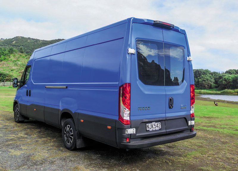 Mitsubishi Express adds some rear-end design interest to a basic cube with the vertical light cluster, while Iveco can’t disguise its added height.