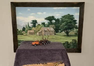 As they say, there is more than one way to skin a cat. Here we are applying the exact same perspective rules as before. However, this time we are using an artificial backdrop. The painting is a lifelike representation of typical farming countryside from the 1960s, making the perfect backdrop to photograph the Ford V8 logger against. Using household items, I have raised the model into the lower third of the painting, then added the trusty towel to simulate the surface of raw earth. Another trick you can use when trying to replicate an older image is to use the editing features within your computer’s photo management software. Most computers these days have simple controls to adjust the likes of colour saturation. By lowering some of these levels within the software, you will achieve a more realistic finish, as seen here when you look at the second and third images.