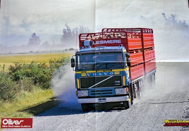Kicking up the Canterbury dust! Some 36 years separate the F12 New Zealand Trucking poster image and Ellesmere’s newest Volvo. (See poster below).