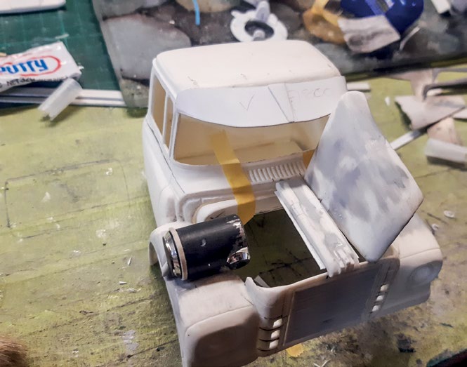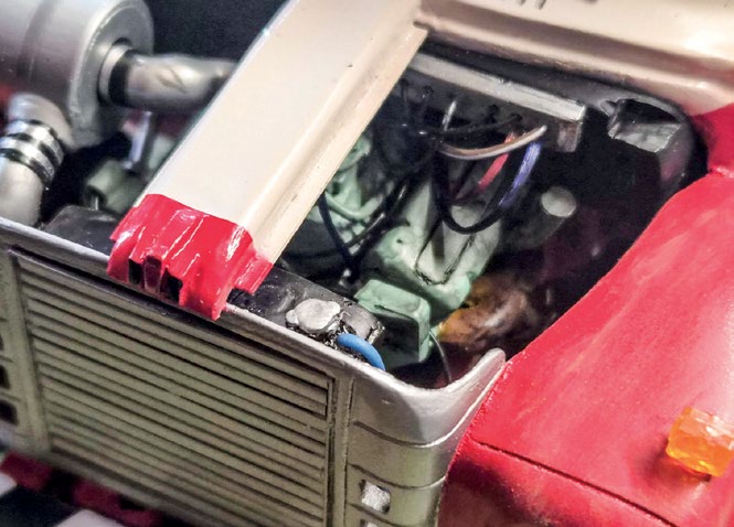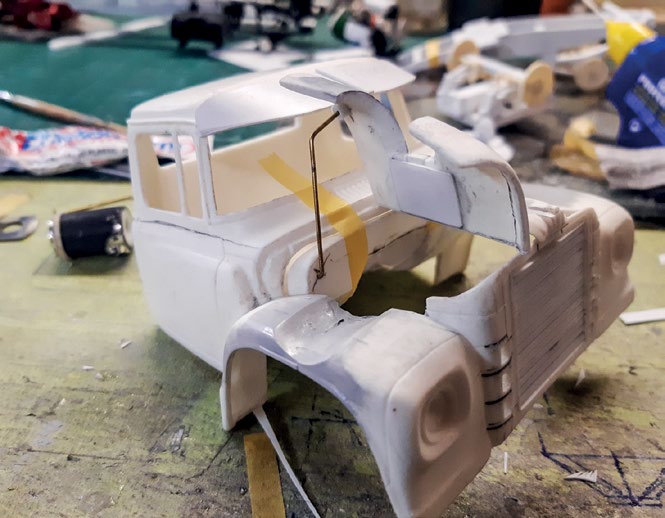 Working with resin cast cabs is a delicate operation, but you can still gently mill and machine the resin into shape, just as Gordon has done here, fitting the period correct Donaldson Cyclopac air-cleaner into the guard and through the bonnet. Note the bonnet stand that Gordon has folded up out of a light-gauge steel wire.