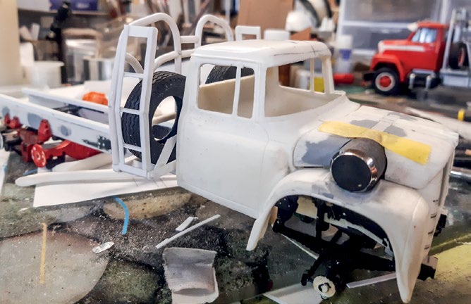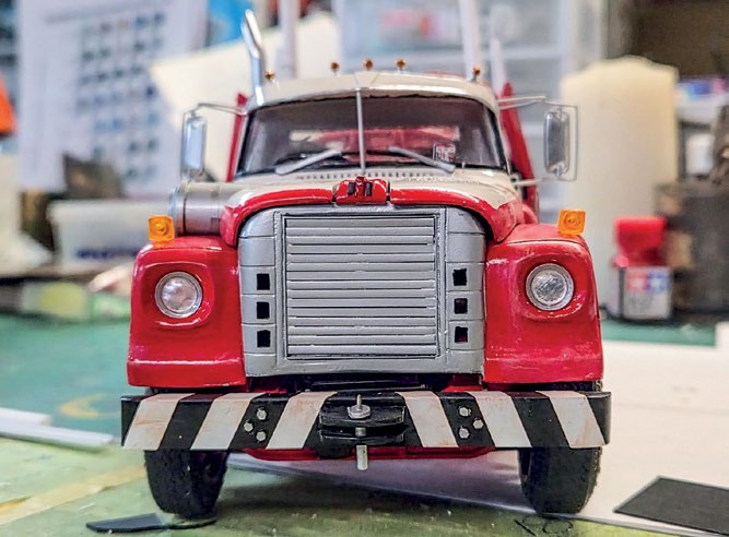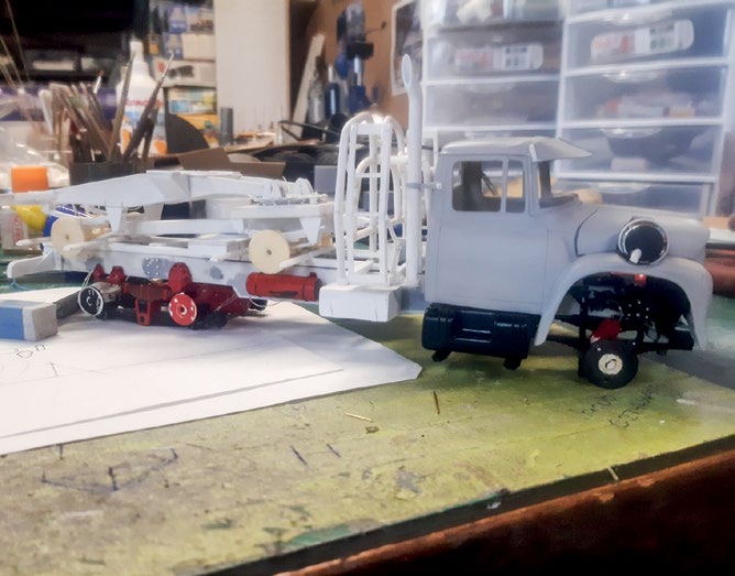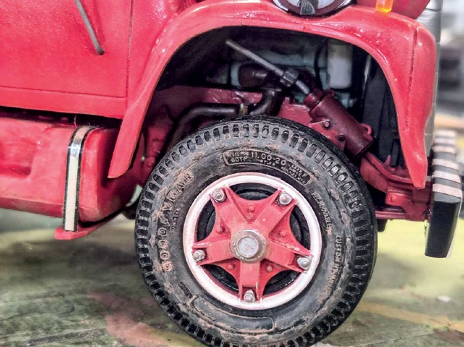 Running gear was next. Using an AMT 8V71, Gordon chopped it down to a 6V, modifying the rocker covers at the same time. A Roadranger was added, with Hendrickson walking-beam suspension and a set of Rockwell axles also joining the build from out of the spare parts bin. Details like brake pots and associated plumbing were added, with the steering box and linkages modified as required to fit the correct location. The rims are from an early Ertl International S-Line kitset, with an Ertl International Paystar kitset offering up its diesel tanks to the build.