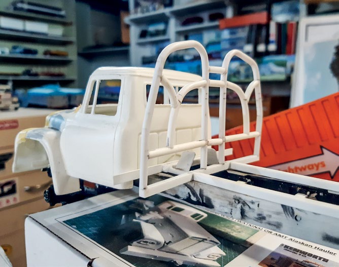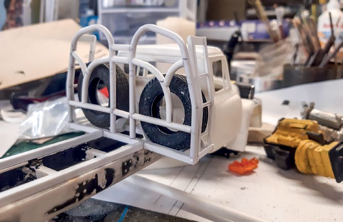In the era that F1800D Internationals clambered through the forests of New Zealand, unreliable cross-ply tyres were your only option, so carrying a couple of spares on board was a must. Here, Gordon has, by using old photos, replicated the combination headache rack/ carrier arrangement that was at the time fitted to RG Woolston trucks. The attention to detail is impressive, including operating retainer ramps.
