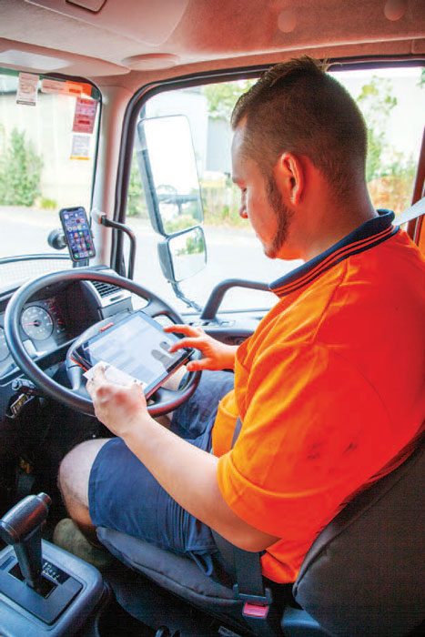 It wasn‘t a quick and easy process, though. Liam had to open a business (LBS Trucking), get his transport services licence, put down all his savings as a deposit on the vehicle, and get finance for the balance. It took a few months, but by the middle of January Liam was standing in the Onehunga yard of Green Gorilla waiting to get to work behind the wheel of his new Fuso Fighter FK1425. “Green Gorilla buys the chassis new from Keith Andrews Trucks and preps it for sale to the contractors. The body is a refurbished unit with new paint, bed seals and electrics. The truck is actually derated to 12 tonnes and known as the FK1225. They‘re very manoeuvrable, the turning circle is very good,” Liam says. Part of the prepping Green Gorilla does is to fit the truck with its radio comms, a rear-facing camera, and the in-cab iPad that allows Liam to manage his jobs for the day. The only thing he‘s done to it was to put on a set of polished rims. He clearly takes pride in it and says the Fuso gets a wash at the end of every day. “It‘s a positive image thing. At so many of the building sites I turn up to they say, ‘wow, your truck‘s so clean‘, ‘it looks mint‘.