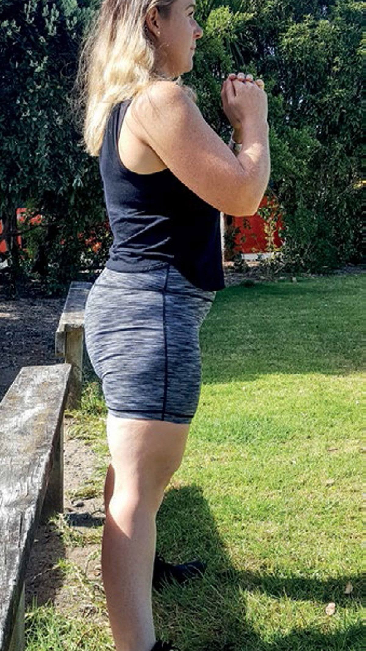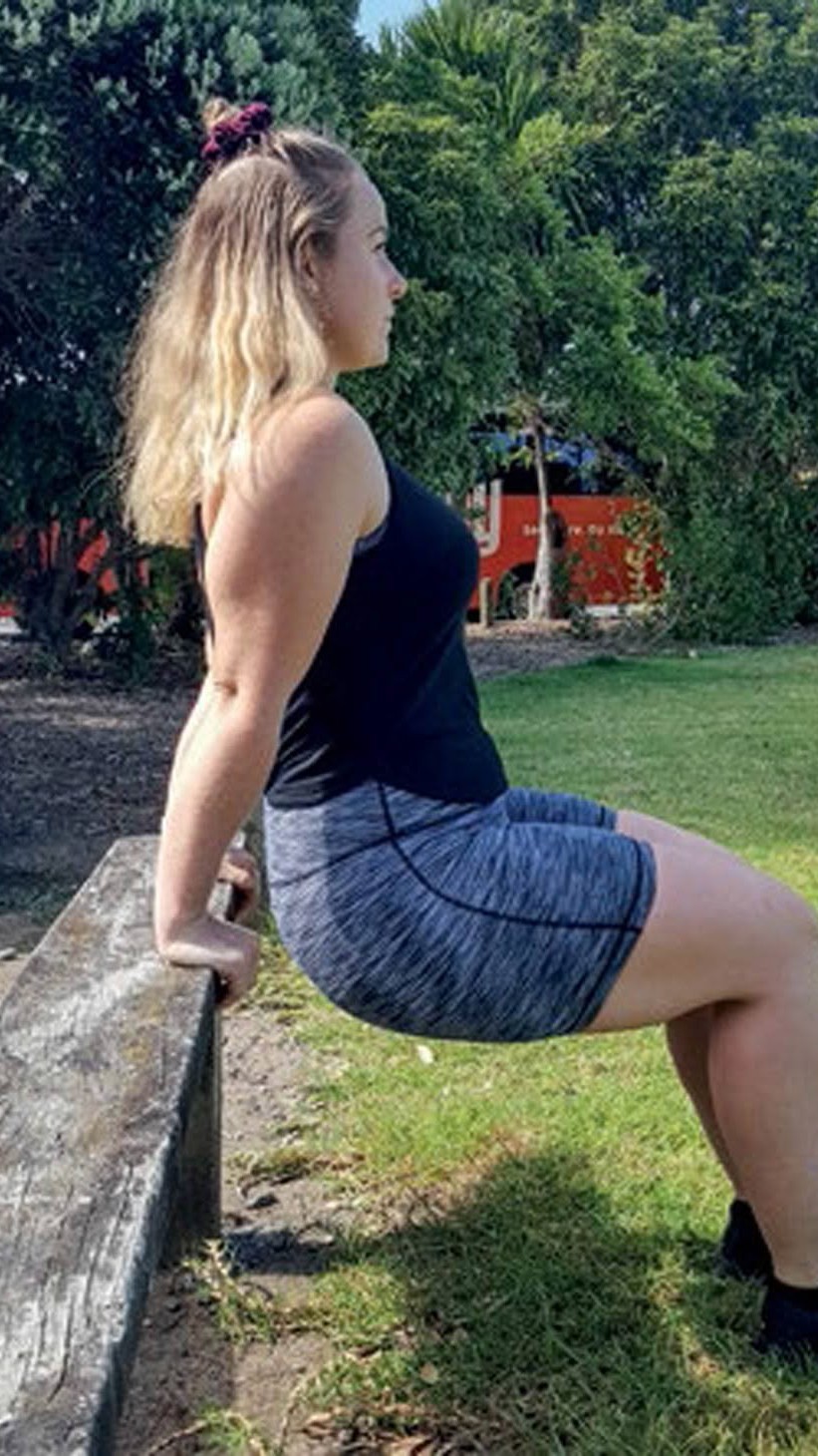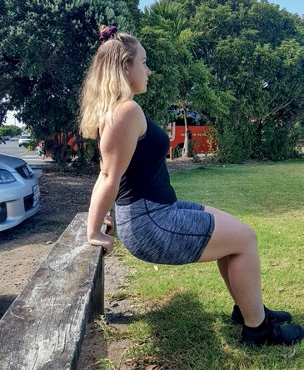 Start with your hands placed firmly backwards on the bench seat. Move your feet out from the bench until you feel comfortable. Tip – the further your feet are out from the bench, the more challenging the movement will be on your upper body. Lower your body slowly, bending at the elbows (please ensure that your elbows don’t lift higher than your shoulders – this will protect your shoulder joints). You should feel a good burn in the back of your arms through your triceps.