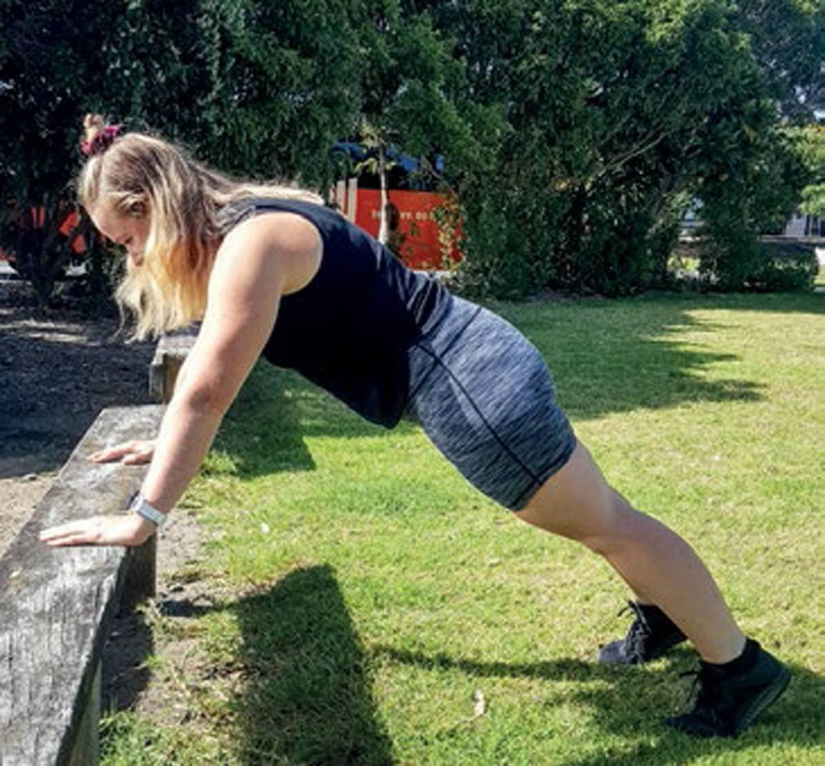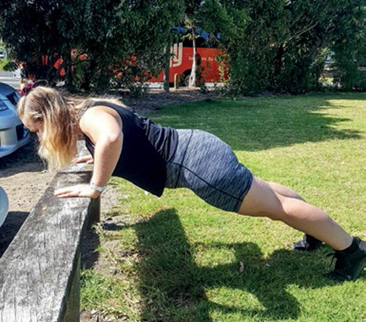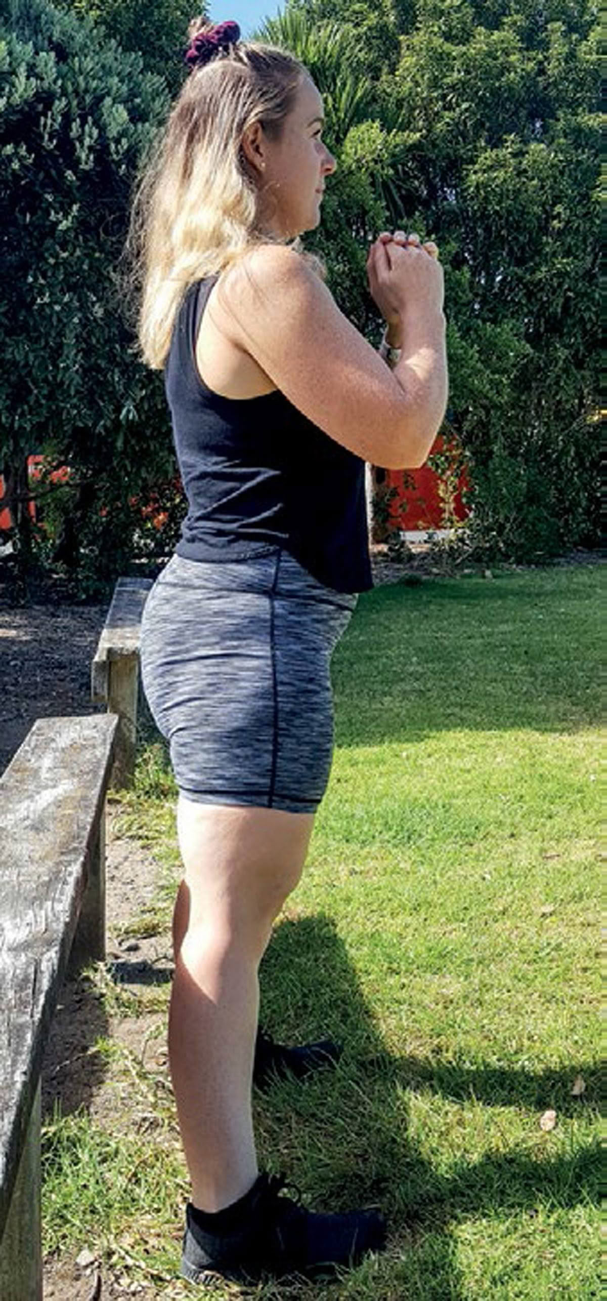 Start with your hands placed firmly backwards on the bench seat. Move your feet out from the bench until you feel comfortable. Tip – the further your feet are out from the bench, the more challenging the movement will be on your upper body. Lower your body slowly, bending at the elbows (please ensure that your elbows don’t lift higher than your shoulders – this will protect your shoulder joints). You should feel a good burn in the back of your arms through your triceps.
