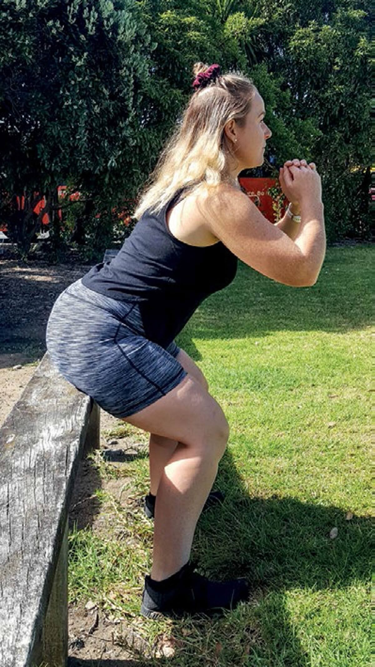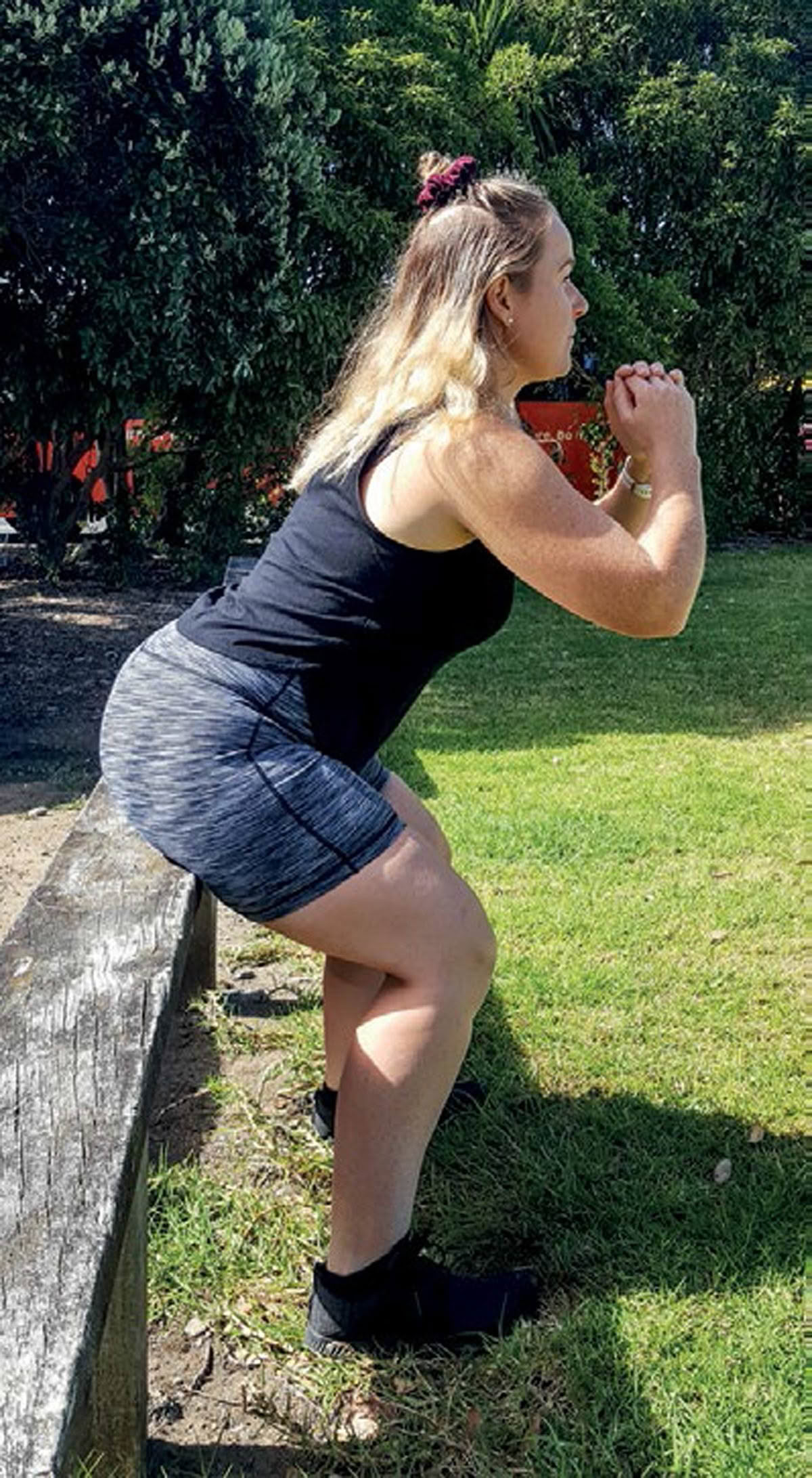 Start with your feet hip-width apart, keep your chest up and look straight ahead as you lower yourself onto the bench. To keep the movement challenging, ensure you don’t sit down on the bench. Instead, touch your bottom to the bench, then drive your body up and pretend the bench is hot! This will keep your legs and glutes working hard and under tension. If you want to spice it up and add a challenge, pulse in the lower half of the movement and feel the burn even more.