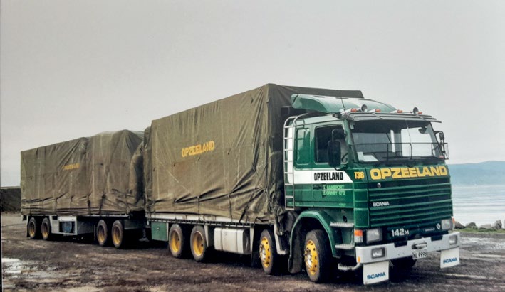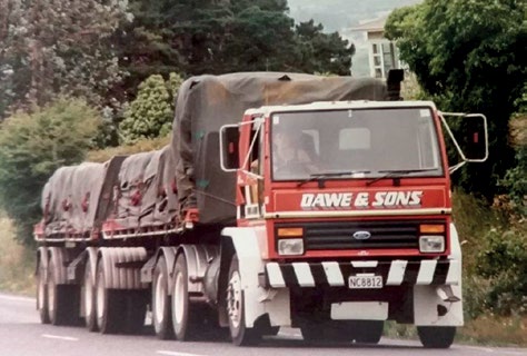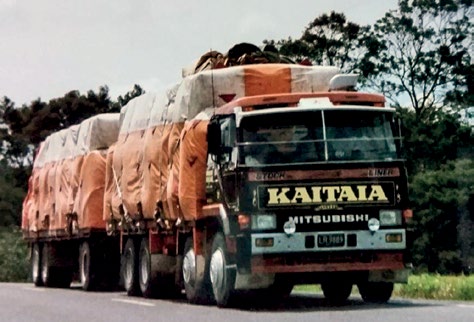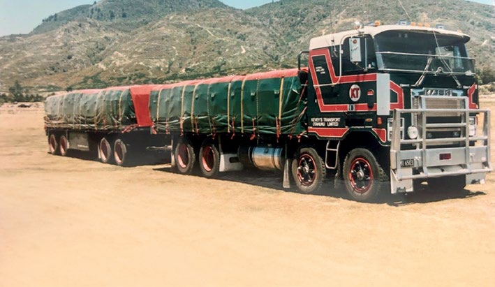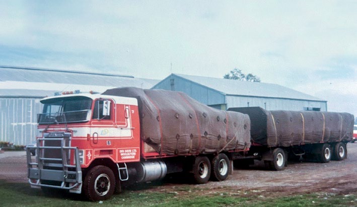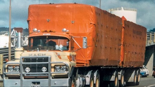 The late Darryl Shellard contracted to well-known Keveys Transport with his rocket – a V8 440hp Mack Cruise-Liner, carting spuds in bins, milk powder or timber all over the North