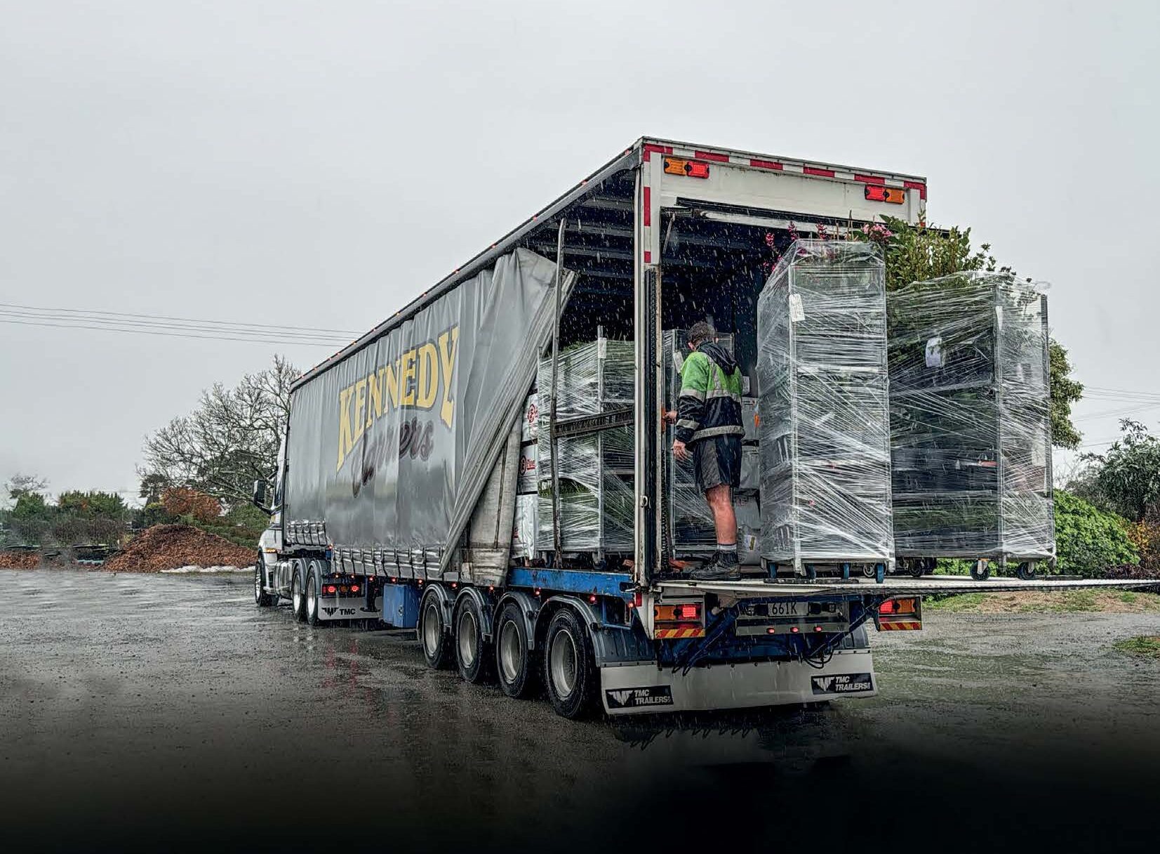 By now, the intensity of the rain had increased, but the tail lift allowed Jimmy to quickly wheel five plant trolleys onto the rear of the unit. He was then onto the forklift to place eight pallets of plants atop the timber – all the while chatting but never once distracted. “You’ve got to be careful with plants in this weather,” he says. “You’d think they’re light, but it’s the wet soil that can push the weight up.”
